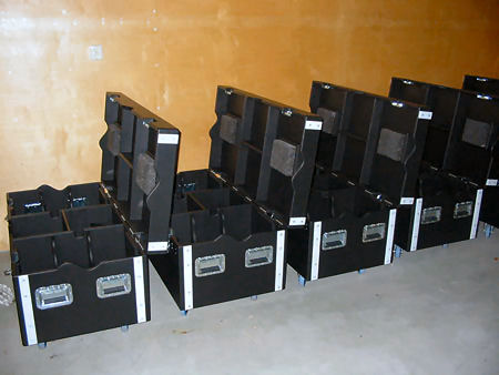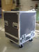 Een stolpkist (kist met een lage bodem en een hoge deksel),in dit geval voor een 19" binnenrack. De binnen kant van de kist is met schuim bekleed zodat het houten of met tapijt beklede binnenrack enigszins geveerd is en netjes blijft tijdens het transport. Het binnenrack kan tijdens gebruik in de bodem blijven staan of eruit worden genomen. Twee van de zwenkwielen zijn geremd. |